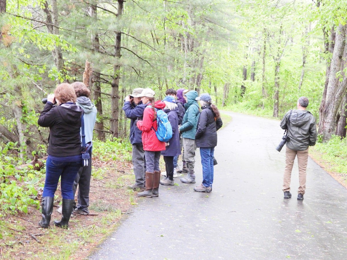 A light sprinkle greeted us as we gathered, but it gradually cleared, giving way to sunshine as the morning went on. Right from the start, bird song filled the air. We took a quick detour off-trail to follow the sound, hoping to catch a glimpse of whatever was singing.