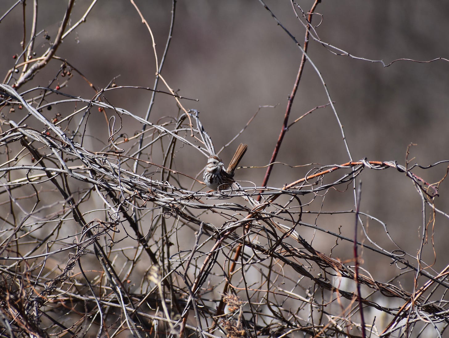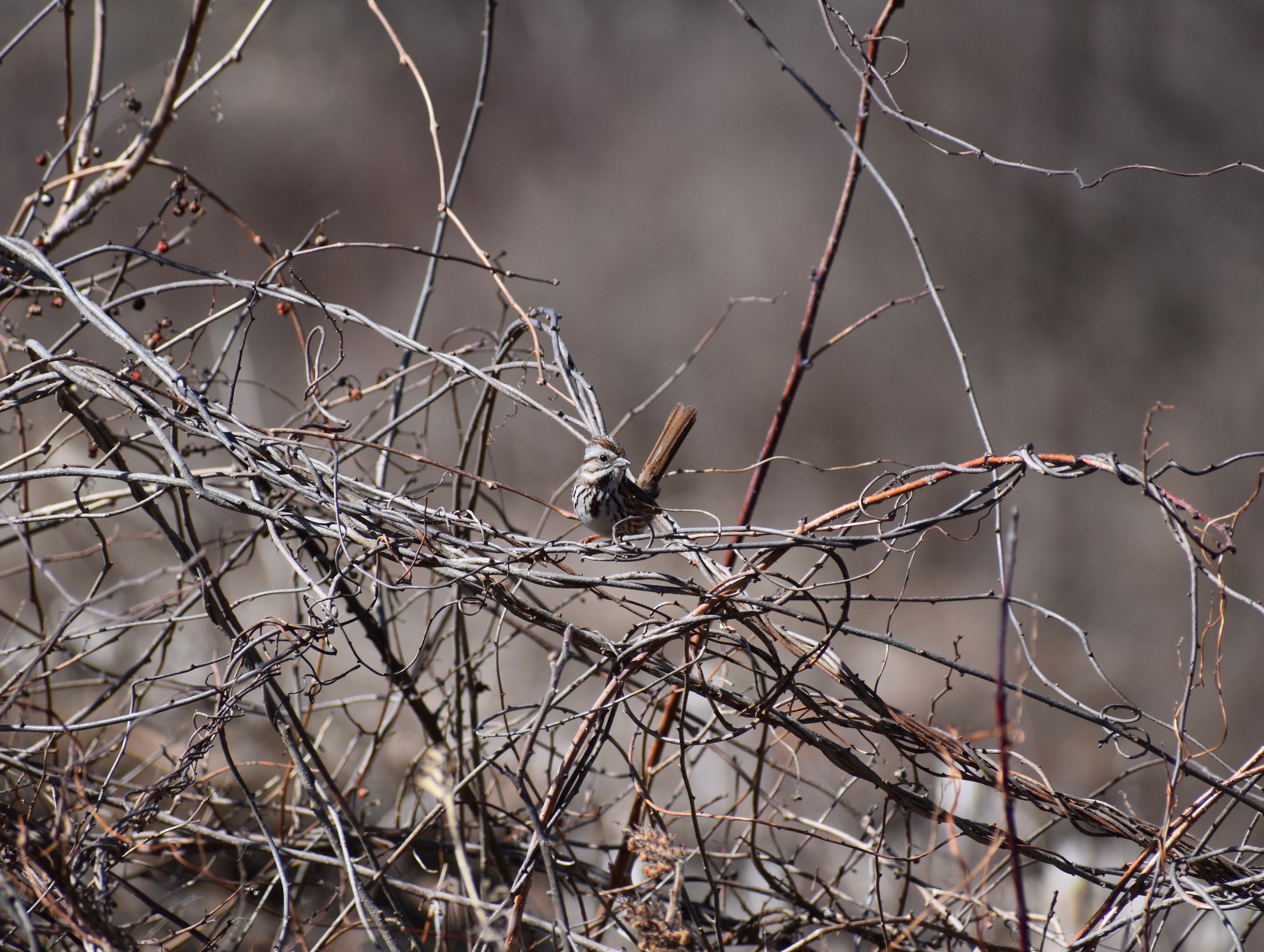 My next stop was the Seabrook Town Forest, where I hoped to spice up my day a bit. As I arrived, a Turkey Vulture teetered overhead near the entrance. I started down the trail, but like most of my walks today… silence. The pond was still frozen over, so there weren’t any waterfowl to scan for either. Eventually, I made my way to the power line cut-through, where a lone Song Sparrow popped out of a small bush. I couldn’t help but feel for this little guy. Alone in the freshly trimmed clearing, I wondered why he was by himself. He was surprisingly cooperative, so I sat with him for a moment, taking his picture. Continuing along the path, I heard a few titmice and chickadees calling in the distance. As I neared the Water Department at the end of the trail, I suddenly found myself in the middle of a flock of robins. 25 to 30 of them on either side of the path, flying back and forth, calling to one another. It was pretty cool to stand there and just take it all in. On my way back to the car, the trail had fallen quiet again. Once I got in, I decided to take a break and return at sunset to look for American Woodcocks. For now, I had finished with 14 species here at the Town Forest. https://ebird.org/checklist/S217725983